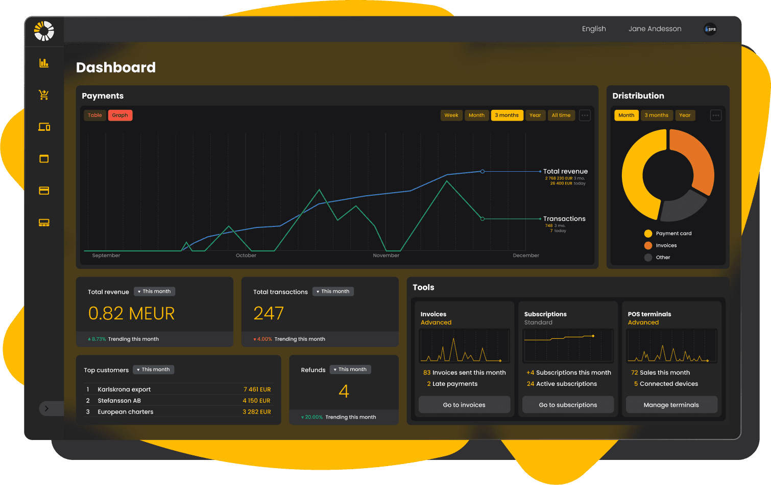Our user-friendly admin system simplifies transaction management with exportable transaction lists, detailed data, and statistics. You can easily send payment links, process refunds, send reminders, and receive real-time notifications for saved cards and completed payments.